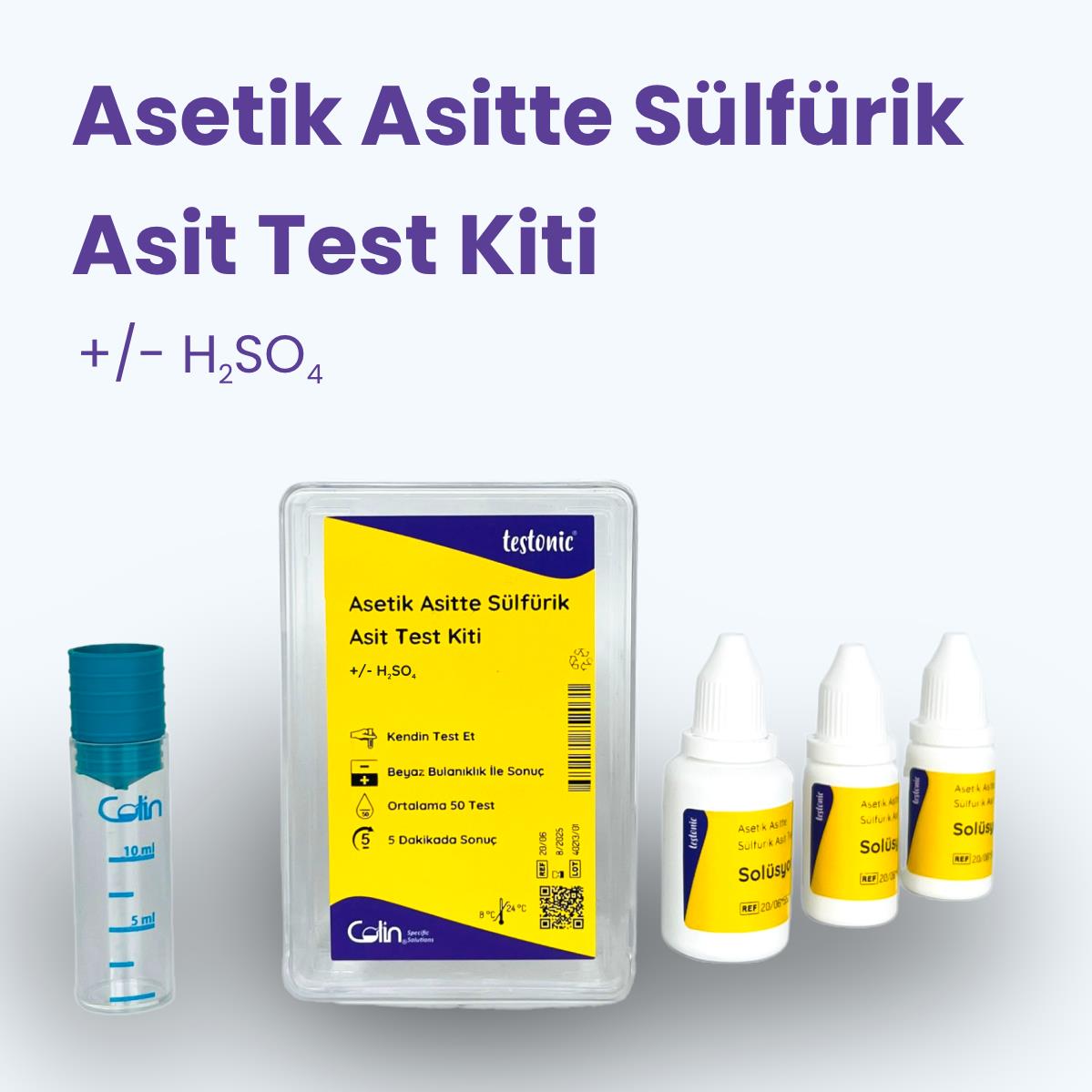 Sülfürik Asit Varlık Testi, asetik asit (CH³COOH) içeren çözeltilerde sülfürik asit (H²SO4) varlığını belirlemek için geliştirilmiş pratik bir analiz setidir. Sirke ve asetik asit bazlı hammaddelerde saflık kontrolü amacıyla kullanılmaya uygundur.