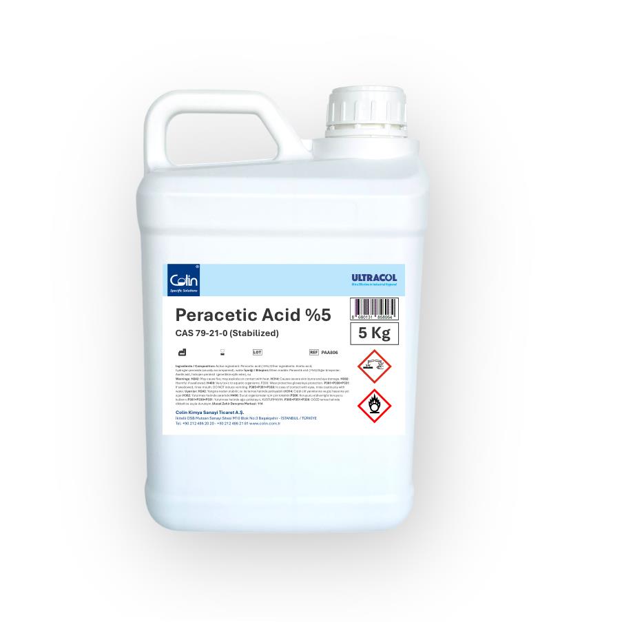 Perasetik Asit 5.0, %5 oranında aktif perasetik asit (PAA) içeren yüksek güçlü oksidatif PAA çözeltisidir. Geniş spektrumlu antimikrobiyal etkisiyle, özellikle gıda endüstrisi, süt ve içecek fabrikaları, tarımsal uygulamalar, sağlık kurumları, oteller, restoran mutfakları ve endüstriyel üretim alanlarında kullanılmak üzere geliştirilmiştir.